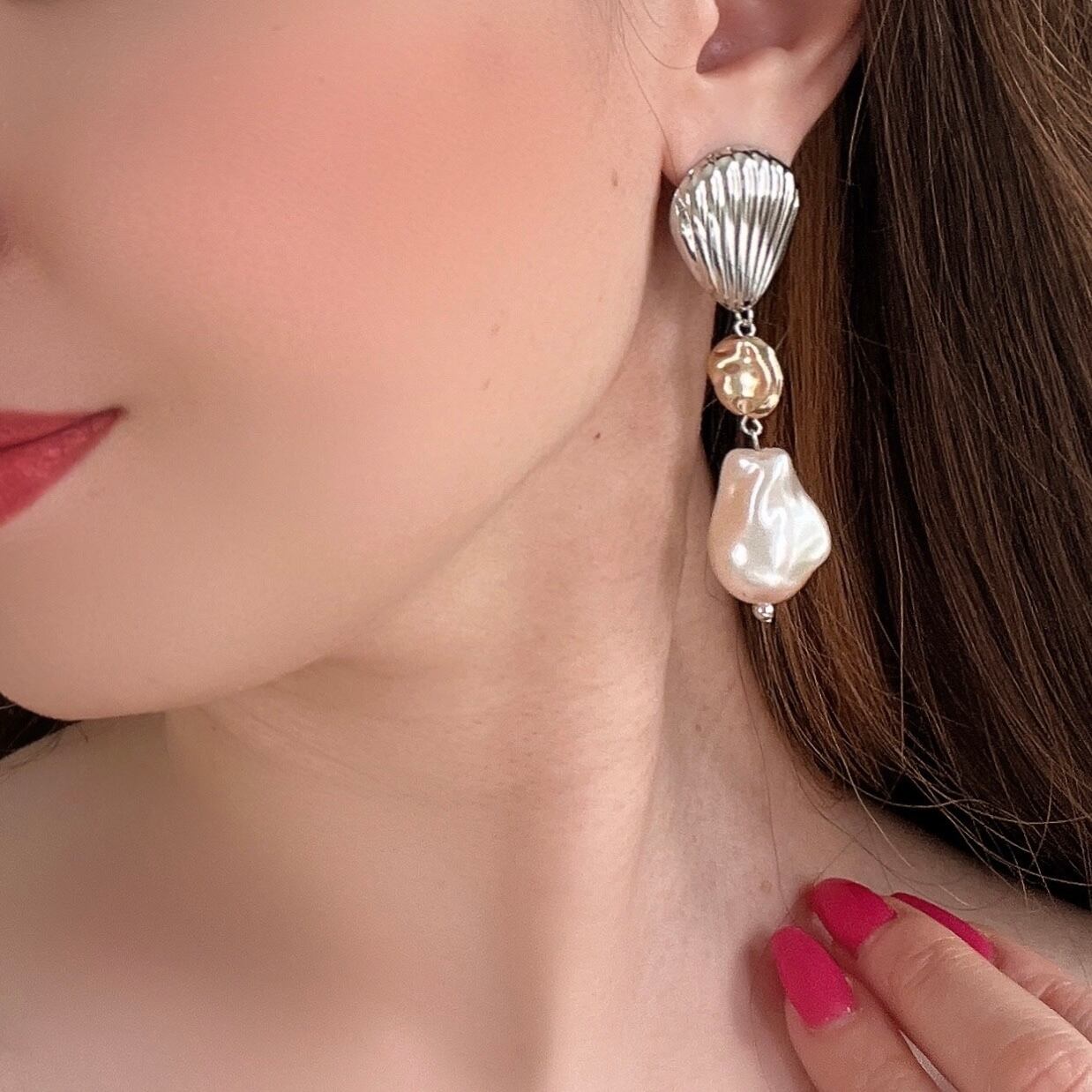 海の宝石をモチーフにしたシェルとバロックパールが輝くデザインは、夏ぴったりのアイテム。大ブリで華やかなので普段使いだけではなくパーティーシーンにも◎。まるで宝石をつけているような気分にさせてくれます。