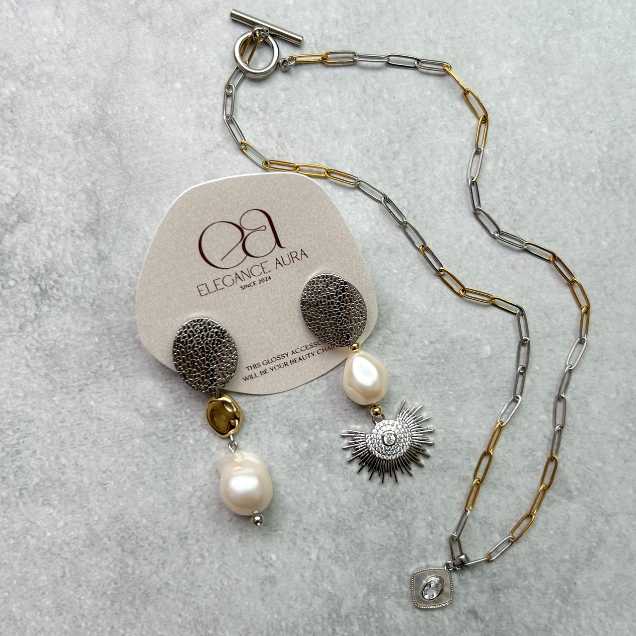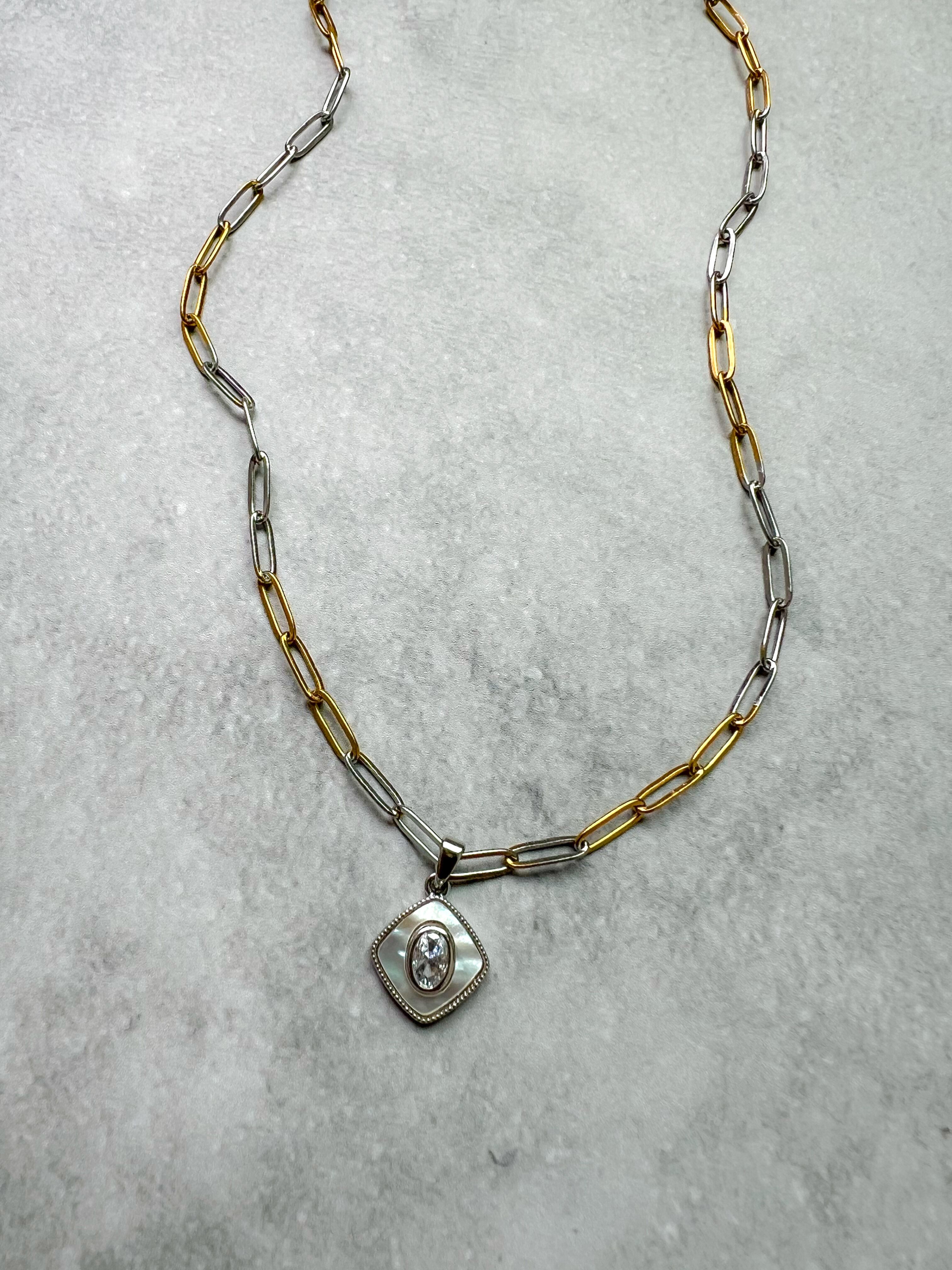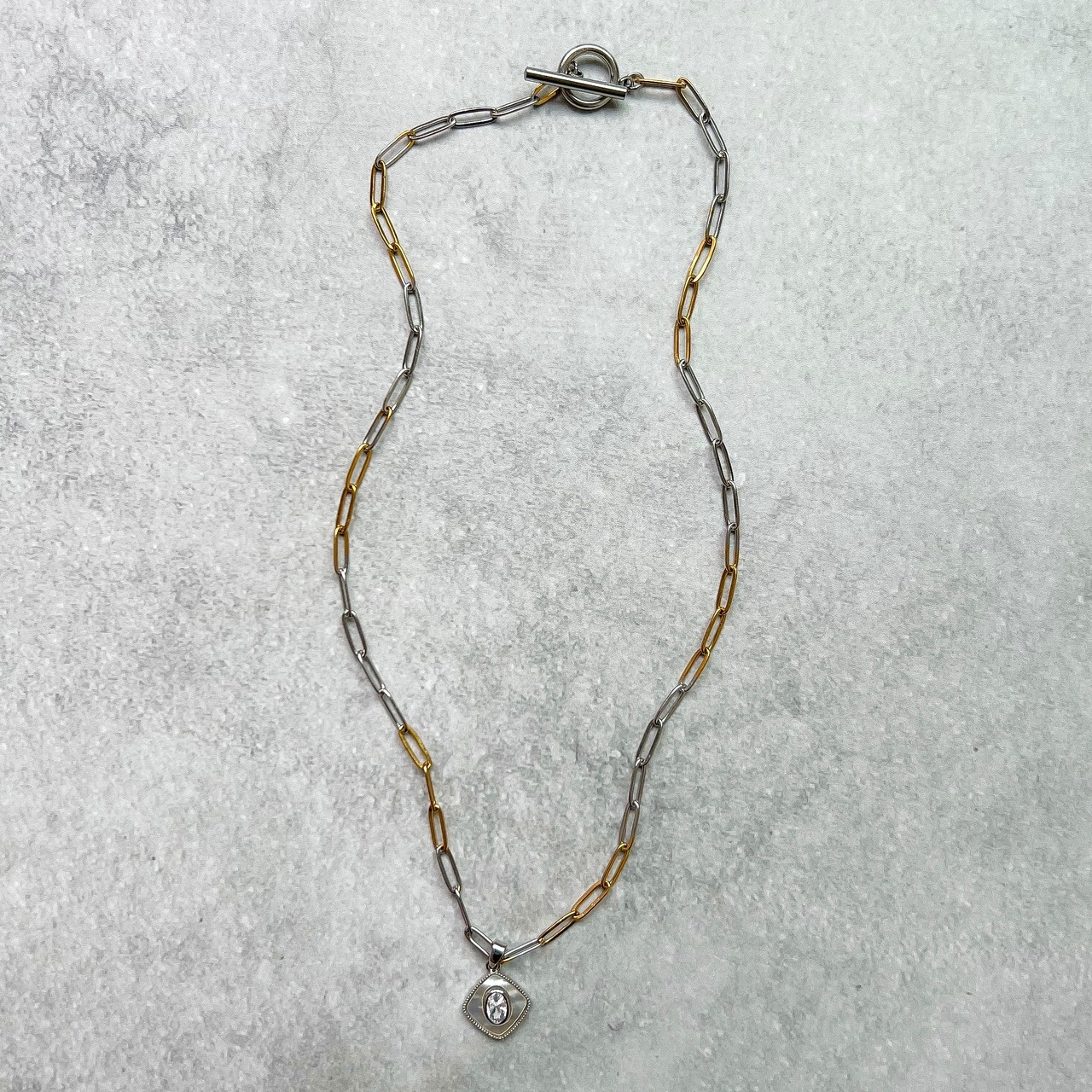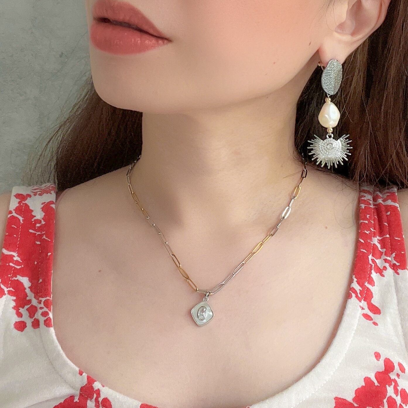 シルバーとゴールドMIXのデュアルトーンがポイントのネックレス。